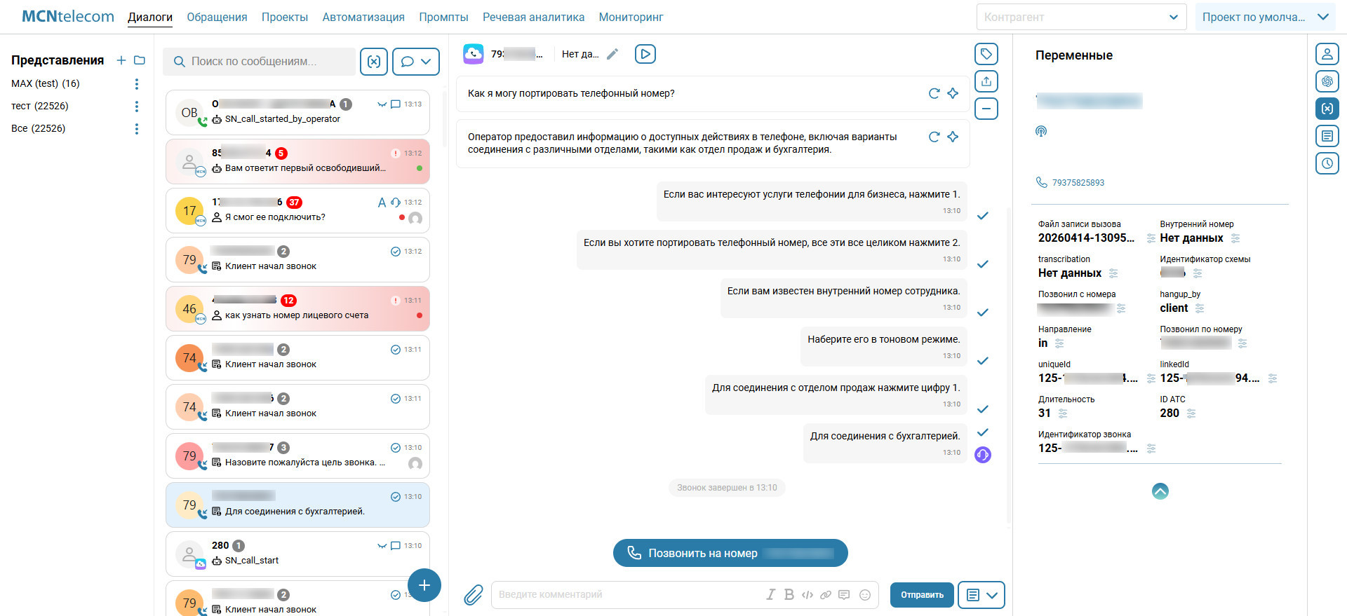 ИИ оценивает все звонки по заданной пользователем инструкции. Искусственному интеллекту может быть поставлена задача: определить информацию о стране обращения, номерах исходящего и входящего звонков, пересказать диалог в краткой форме.